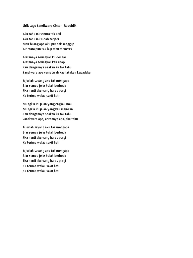 Jujurlah sayang aku tak mengapa Biar semua jelas telah berbeda Jika nanti aku. Sandiwara CintaRepublik Aku tahu ini semua tak adil. I know this have.